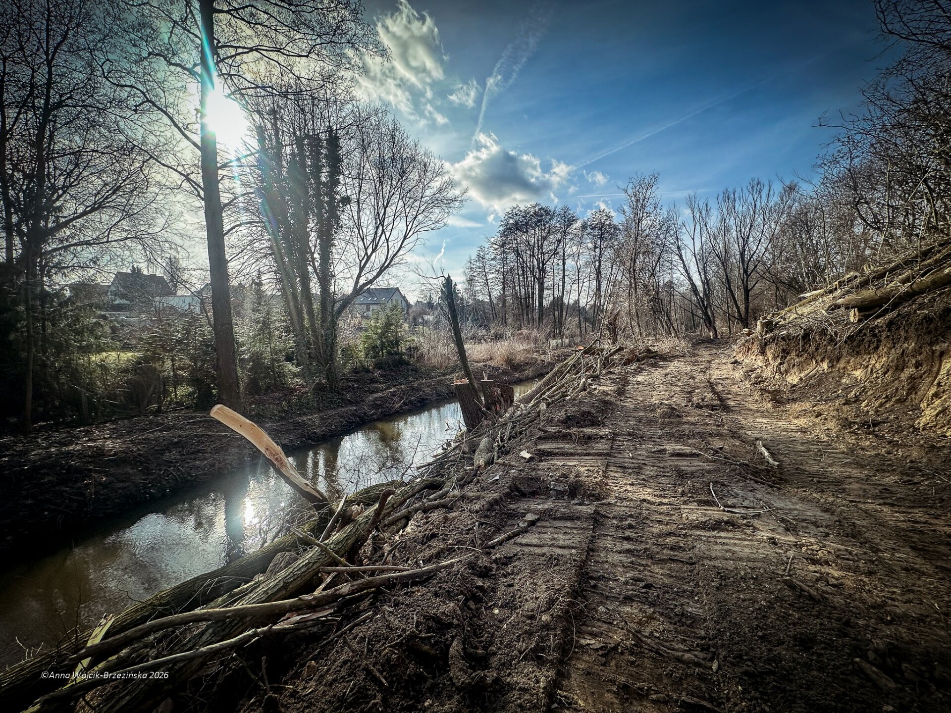 Plac budowy pokazuje prawdziwą skalę tej inwestycji. W fotorelacji widać wycięte drzewa, odsłonięty brzeg Skierniewki i teren, który musi zostać przygotowany pod mury oporowe oraz wzmocnienia skarp.